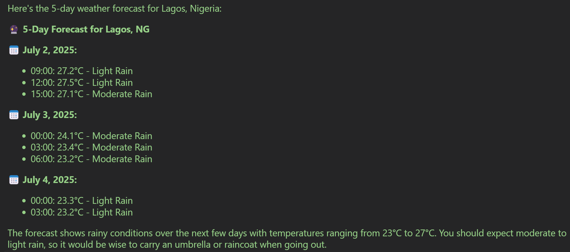 - Ask: “What is the 5-day weather forecast for Lagos?”