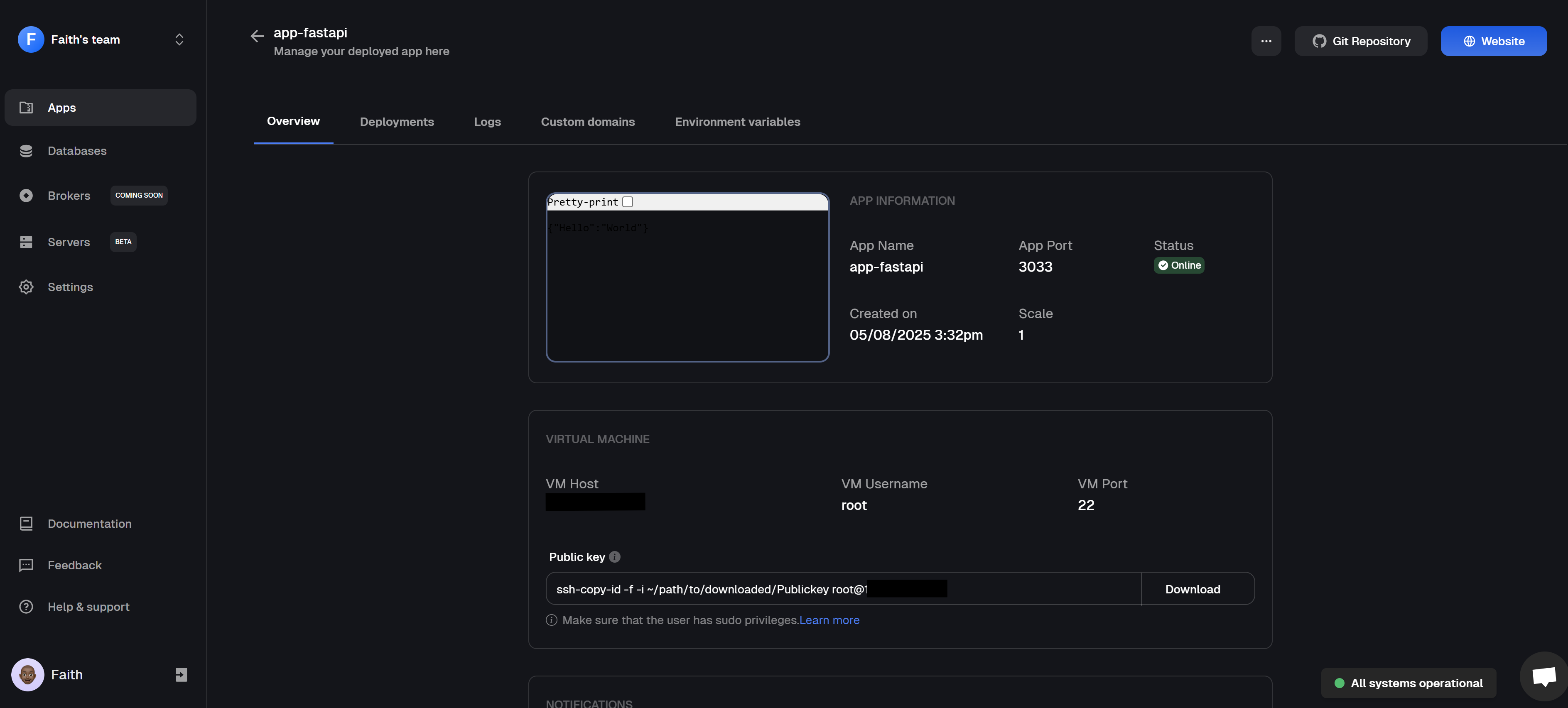After your FastAPI app is live on an AWS EC2 instance using Clouddley, managing it becomes straightforward. From the apps dashboard, you can take care of everything without logging into the server. You can update settings, scale, roll back to previous versions, pause or resume the app, or even delete it. The dashboard also gives you tools to view deployment history, check logs, manage environment variables, and connect a custom domain all in one place.FastAPI Application Best Practices