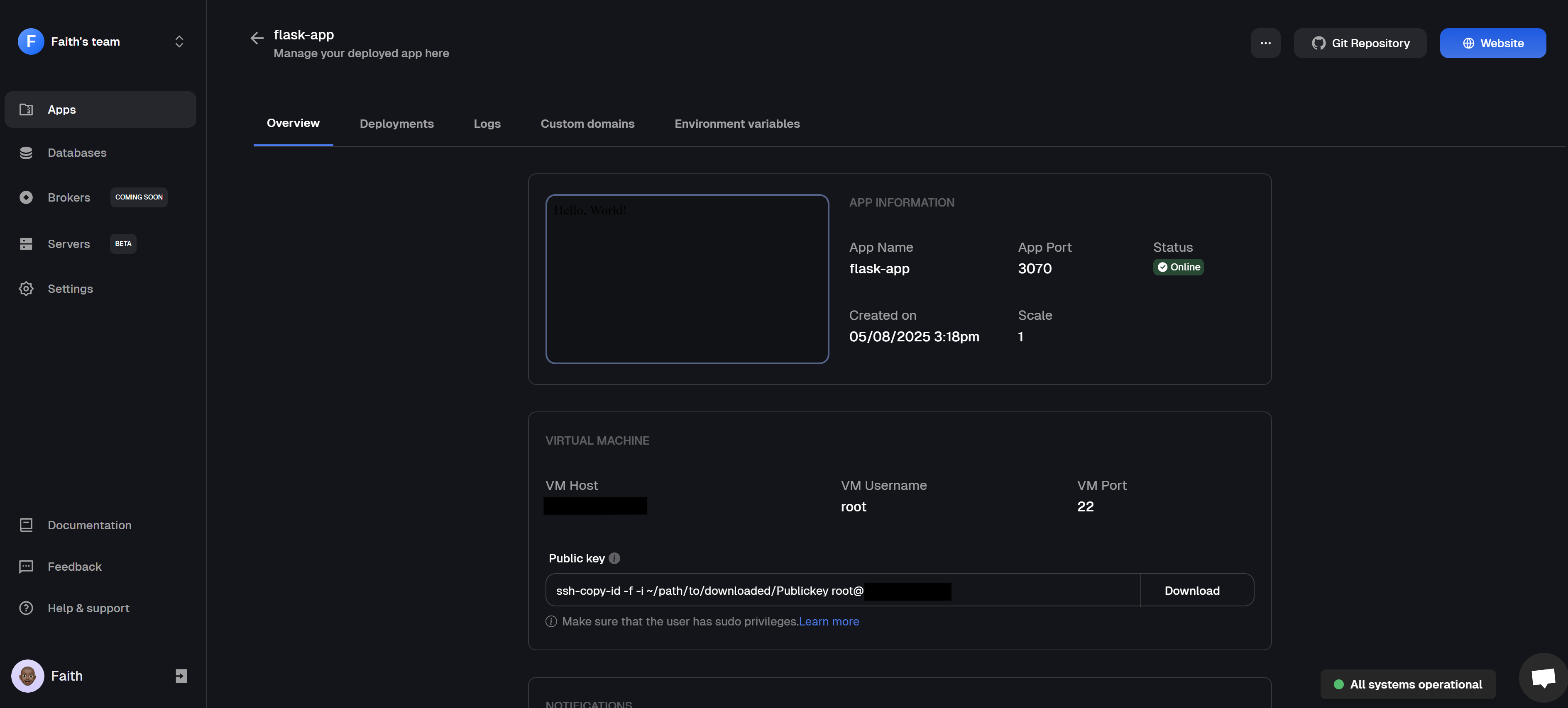 After deploying your Flask app to a DigitalOcean Droplet using Clouddley, you can manage everything from the apps dashboard, there is no need to log into the server.You can modify deployment settings, scale your app, roll back to a previous version, pause or resume the app, or delete it when needed. The dashboard also includes helpful features like deployment history, live logs, environment variables management, and custom domain setup, making it easy to stay on top of your app after deployment.