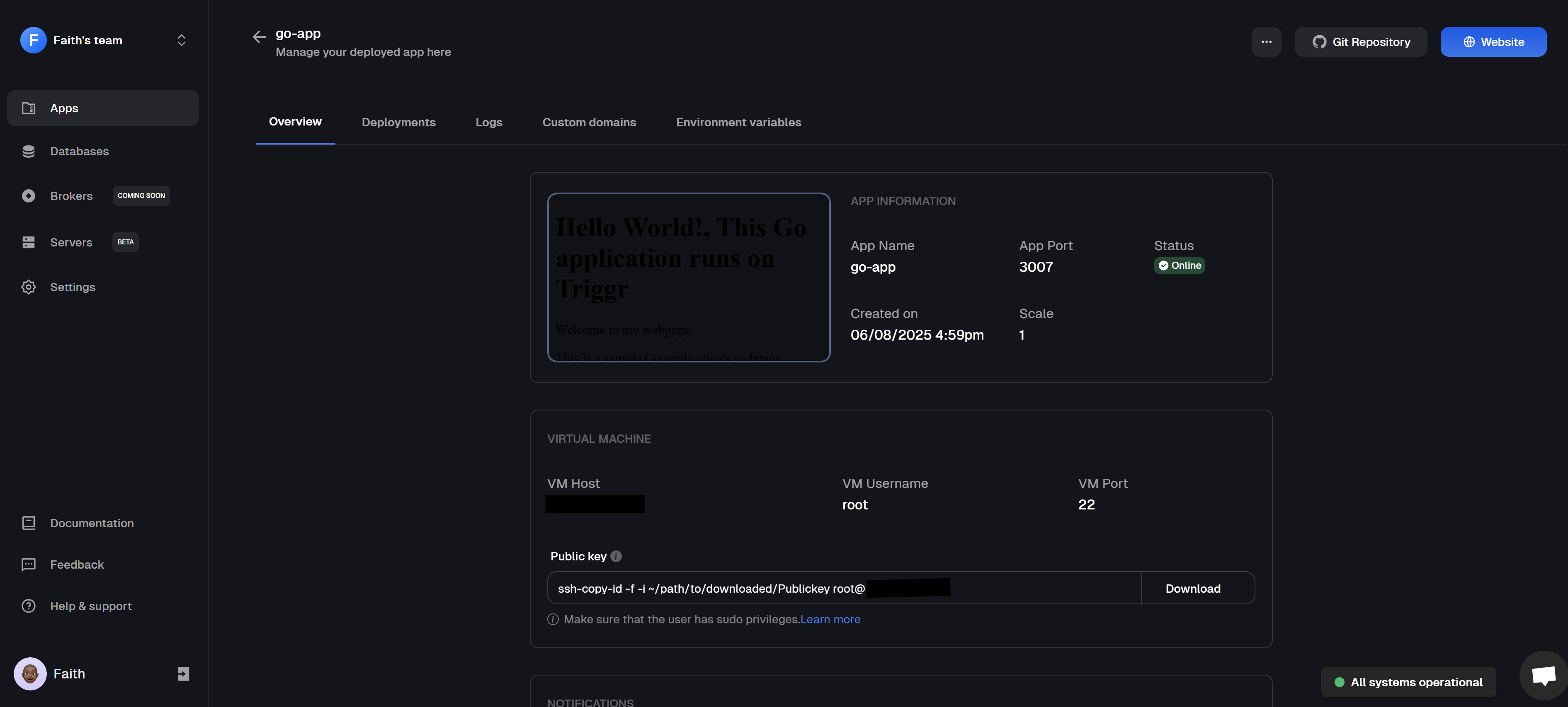 Once your Golang application is up and running on an AWS EC2 instance using Clouddley, management is simple.The apps dashboard lets you handle key tasks without touching the server. You can adjust the settings, scale your app, roll back to earlier versions, pause or resume the app, or remove the app if needed. You’ll also find helpful features to view your deployment history, check logs, manage environment variables, and connect a custom domain, all in one place.